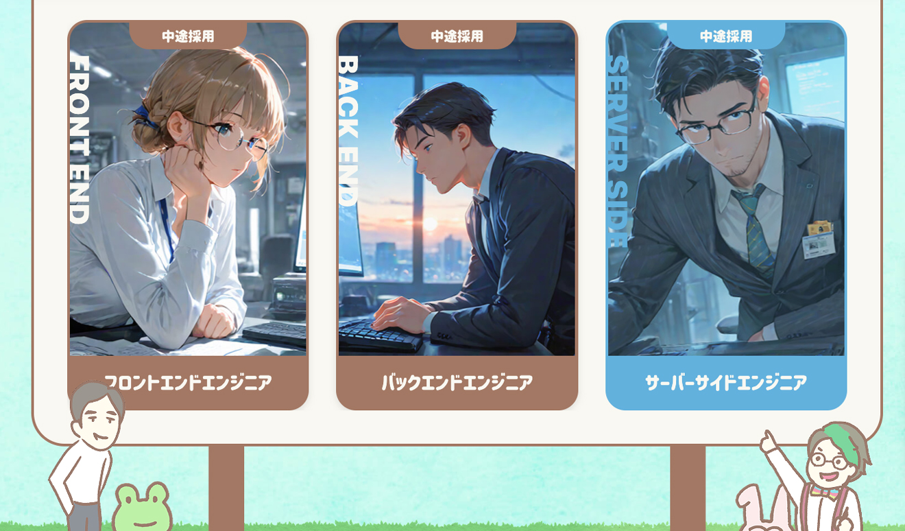 こちらも各募集職種のカードの上にマウスカーソルをホバー(スマホならタップ)することで色が変わり、イラストが動く仕掛けになっています。